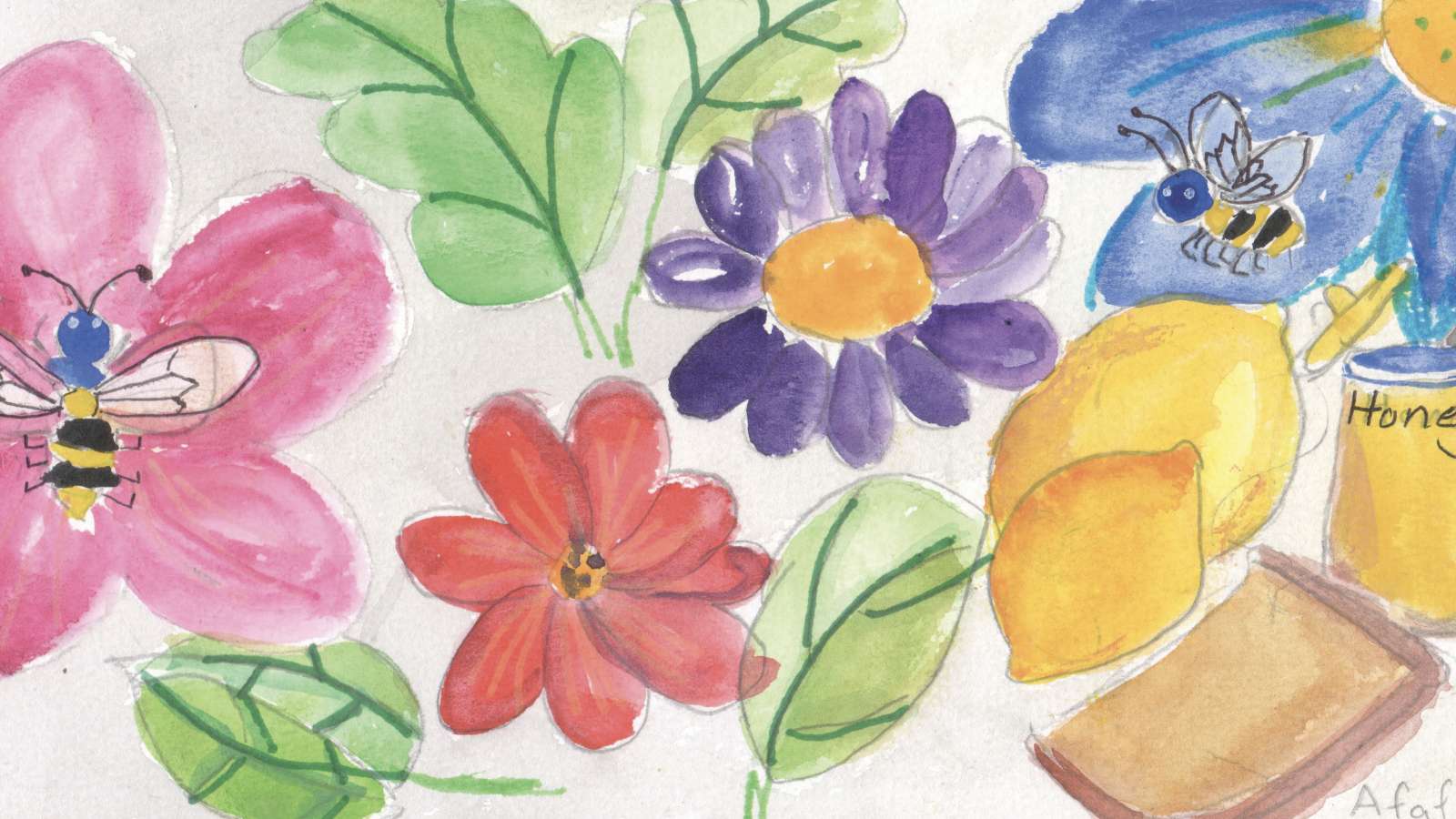 “There were two bees flying around, pollinating the flowers. They saw a person trying to take honey from their beehive. Rather than stinging, the bees flew over to the flowers on the dining table. On the table, there was a jar of honey, bread and lemons.”