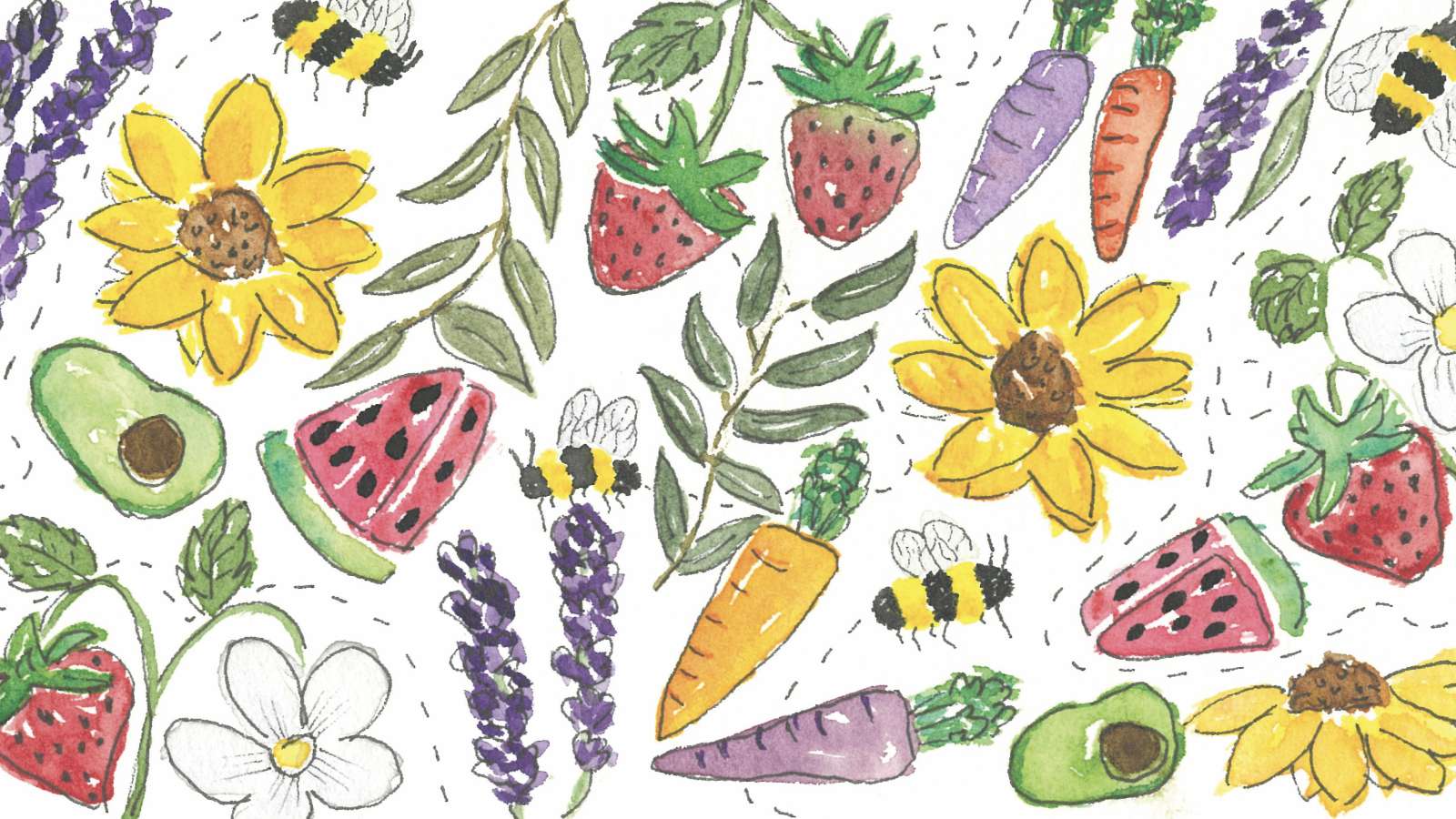 “My inspiration behind this artwork was to portray the important role that bees play during pollination by showcasing some of the flowers and foods that they pollinate. I wanted to include sunflowers, lavender, eucalyptus and strawberries, as well as some fruits and vegetables not typically thought to be pollinated by bees, such as watermelon, avocado and carrots. I also wanted to show the bees buzzing around during pollination. I chose to portray this artwork through vibrant colours using watercolour paint and ink in a loose style by hand.”