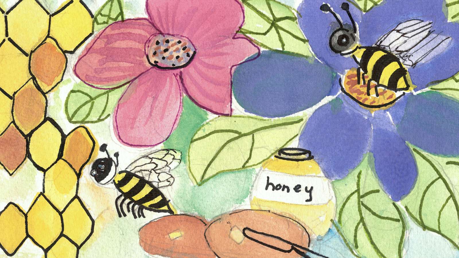 “I had the idea to include honeycomb in the design, because honeycomb is a food and makes a nice pattern. I used bright and bold colours for the flowers so they’d pop and because bees use the pollen to make honey. My teacher told us to include a food, I chose pancakes and a honey jar, because pancakes taste yummy with honey.”