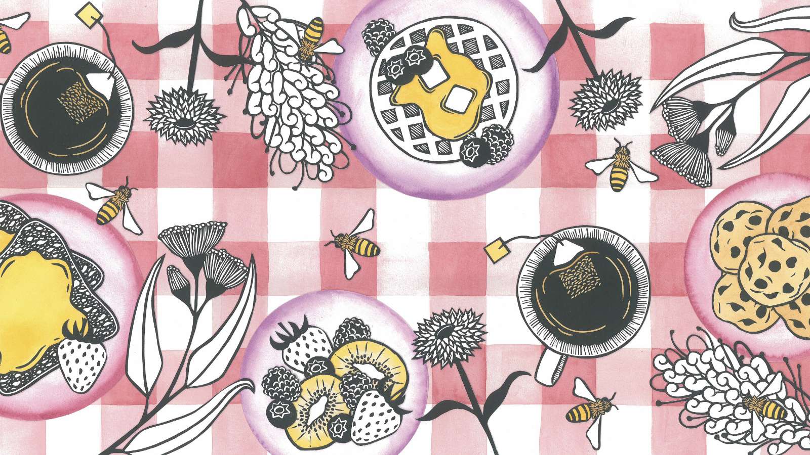 “This artwork was created by carving and printing an assortment of linocuts. Pops of honey colour were added with watercolour paints. Then each linocut print was carefully cut out, layered and glued onto a hand-painted gingham background. ‘Picnic with the Bees’ is inspired by the incredible and important relationship between bees, native Australian flora and our food.”