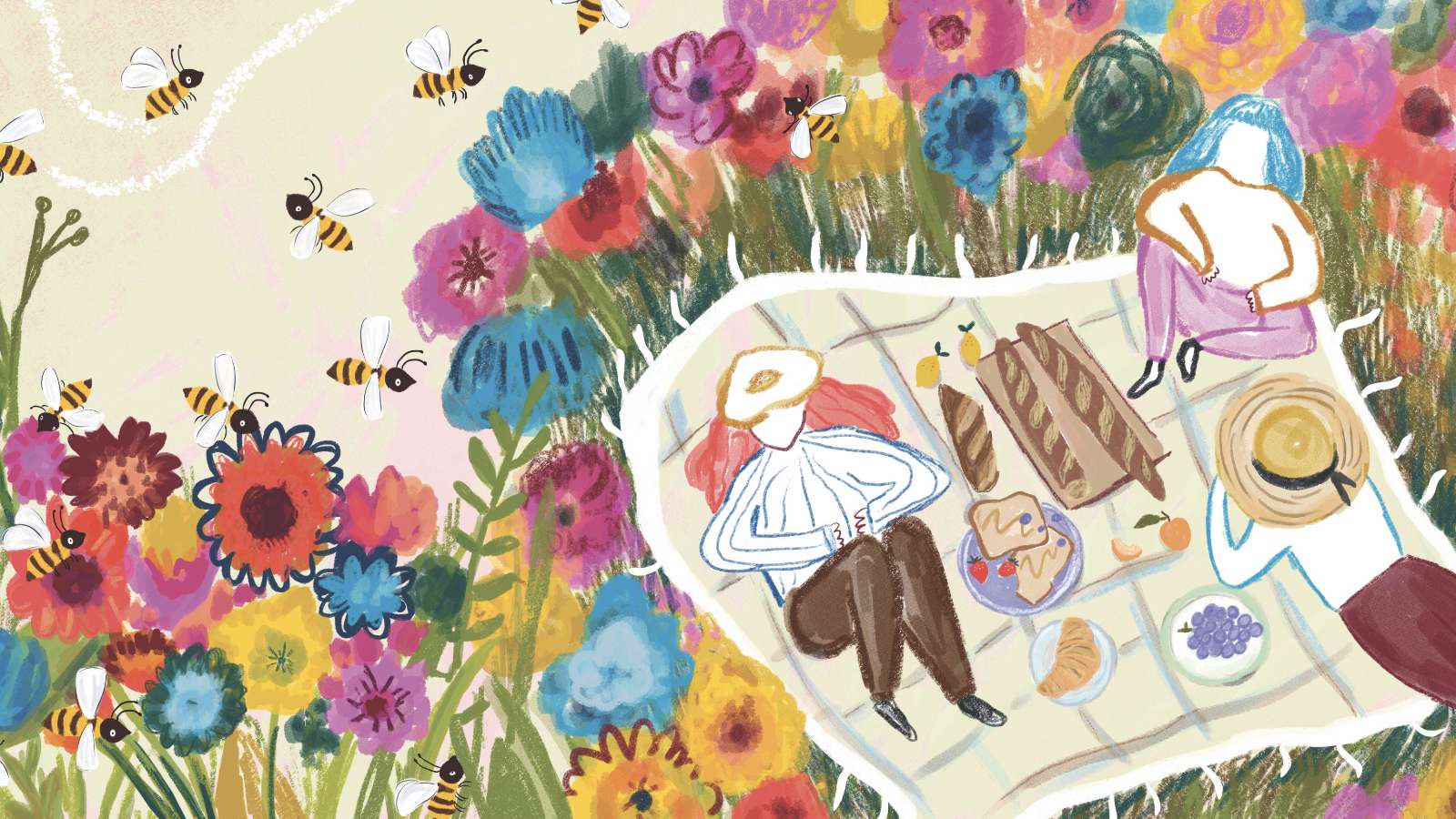 “My artwork shows friends relaxing at a picnic amid a riot of flowers. Fresh bread, fruit, and pastries sit between them as bees weave through the blooms. The piece celebrates the simple pleasure of shared meals and the vital role of bees in nourishing landscapes, highlighting the link between food, community, and pollinators in a colourful, vibrant scene.”