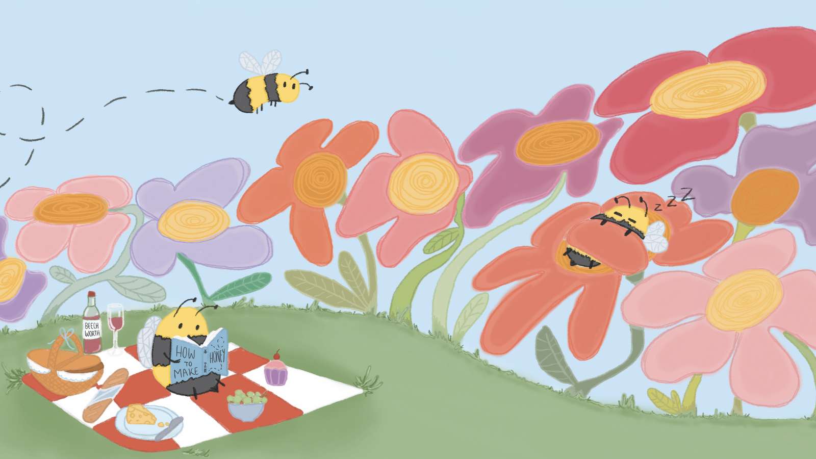 “‘Sleepy Picnic’, explores the vital importance of bees in our ecosystem. My digital illustration, created on Procreate, shows a stylised version of bees in our world. They are responsible for the reproduction of many wild plants, fruits and vegetables, which are depicted through the colourful flowers and various food items on the picnic blanket. My favourite element is the sleeping bee, as some bees do take naps in flowers to conserve their energy or take shelter. I wanted to capture their essential qualities in a lighthearted manner, as it is crucial to continue understanding and educating everyone about their significant roles.”