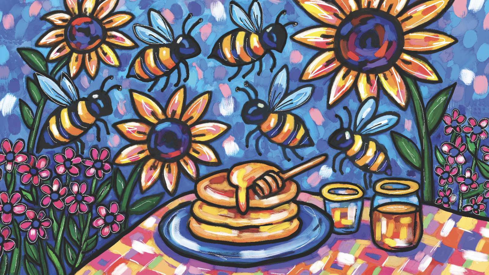 “I have painted sunflowers like this before in acrylic art, so I decided to use that as my starting point. I blended the bees, food, and flowers in my artwork to celebrate nature’s harmony. Bees, pollinating my vibrant sunflowers in bold blues, yellows, and pinks, symbolise industriousness and ecological balance, reflecting growth and beauty. The honey drizzling over pancakes and jars is meant to show the abundance and the fruits of their labour, tying food to nature’s cycle. My aim for the artwork – to highlight environmental stewardship and the joy of natural abundance through my distinctive, vivid technique.”