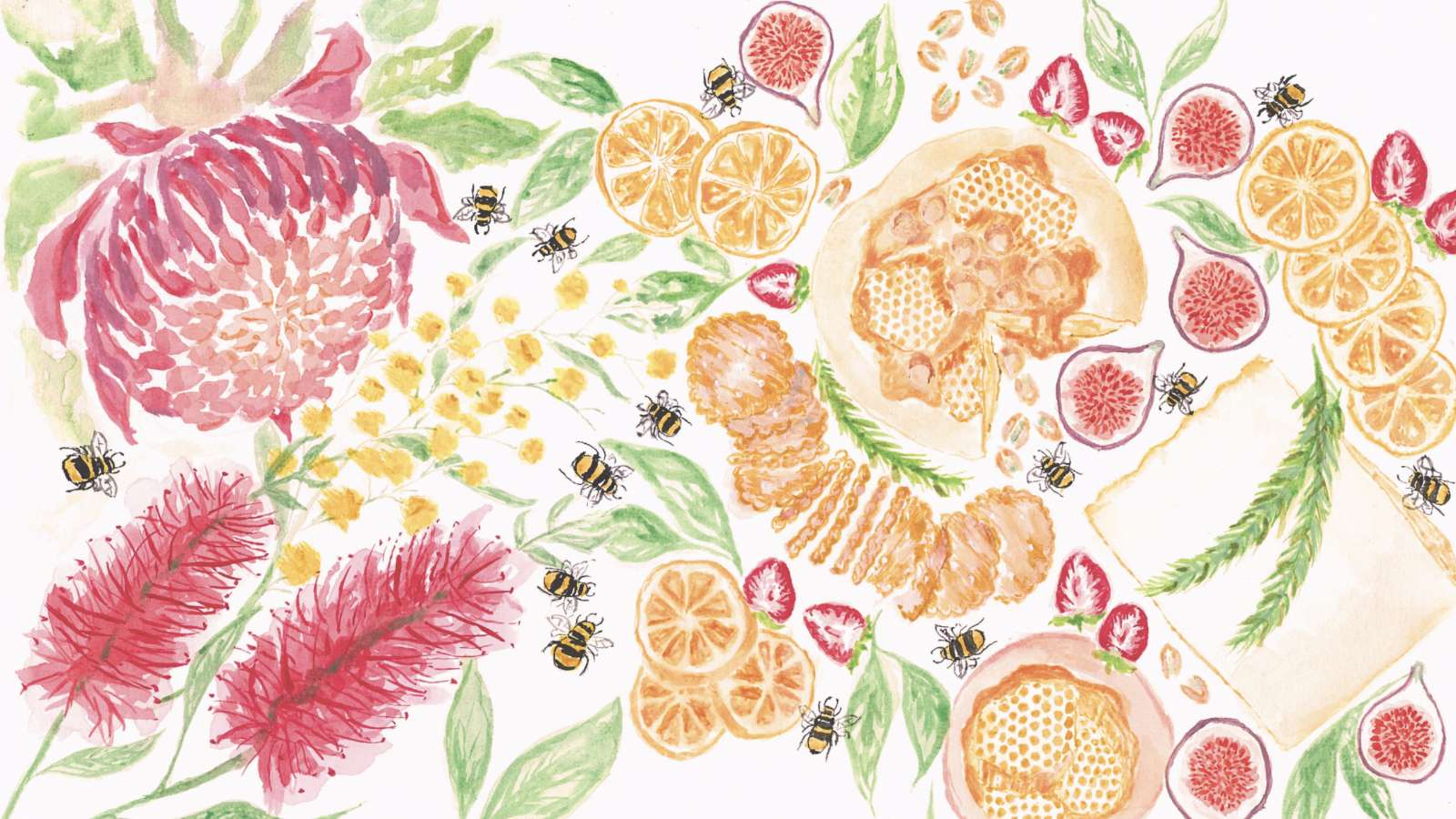 “This piece draws from typical charcuterie arrangements to illustrate the connections between flowers, bees and food, and the way the existence of the native flora depicted largely relies on these small, black and yellow insects. The painting itself incorporates both gouache and watercolour elements, which, whilst similar, provide greater control over the colours and depth of the subjects, allowing for the scene to come alive.”